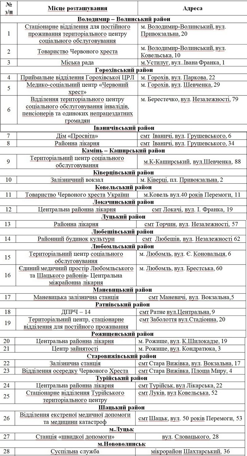 Адреси стаціонарних пунктів обігріву в містах та райцентрах Волинської області: