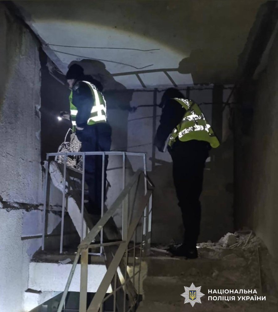 Поліцейські документують наслідки ворожої атаки на Київ, повідомляє у телеграмі Нацполіція.