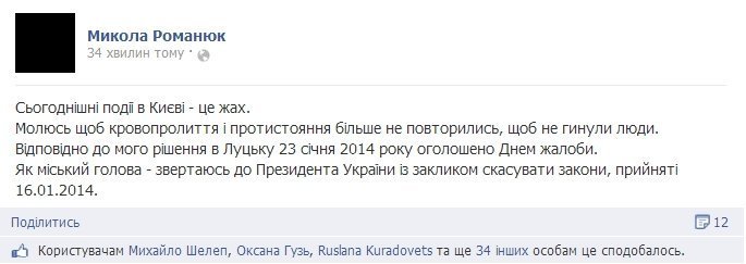 Міський голова Микола Романюк уночі заявив, що оголосив у Луцьку 23 січня День жалоби а також те, що звернеться до Януковича із закликом скасувати «скандальні закони».