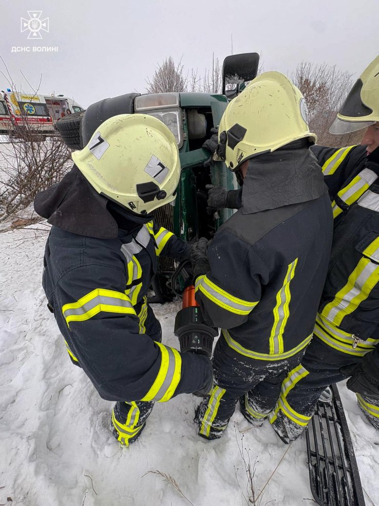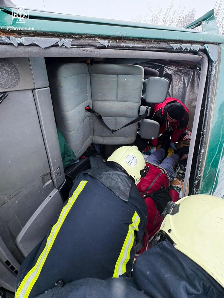 Рятувальники 7-ї державної пожежно-рятувальної частини м. Володимир, використовуючи електричні розтискачі, від’єднали акумуляторну батарею для недопущення загоряння та провели деблокування шести осіб, яких передали працівникам екстреної медичної допомоги.