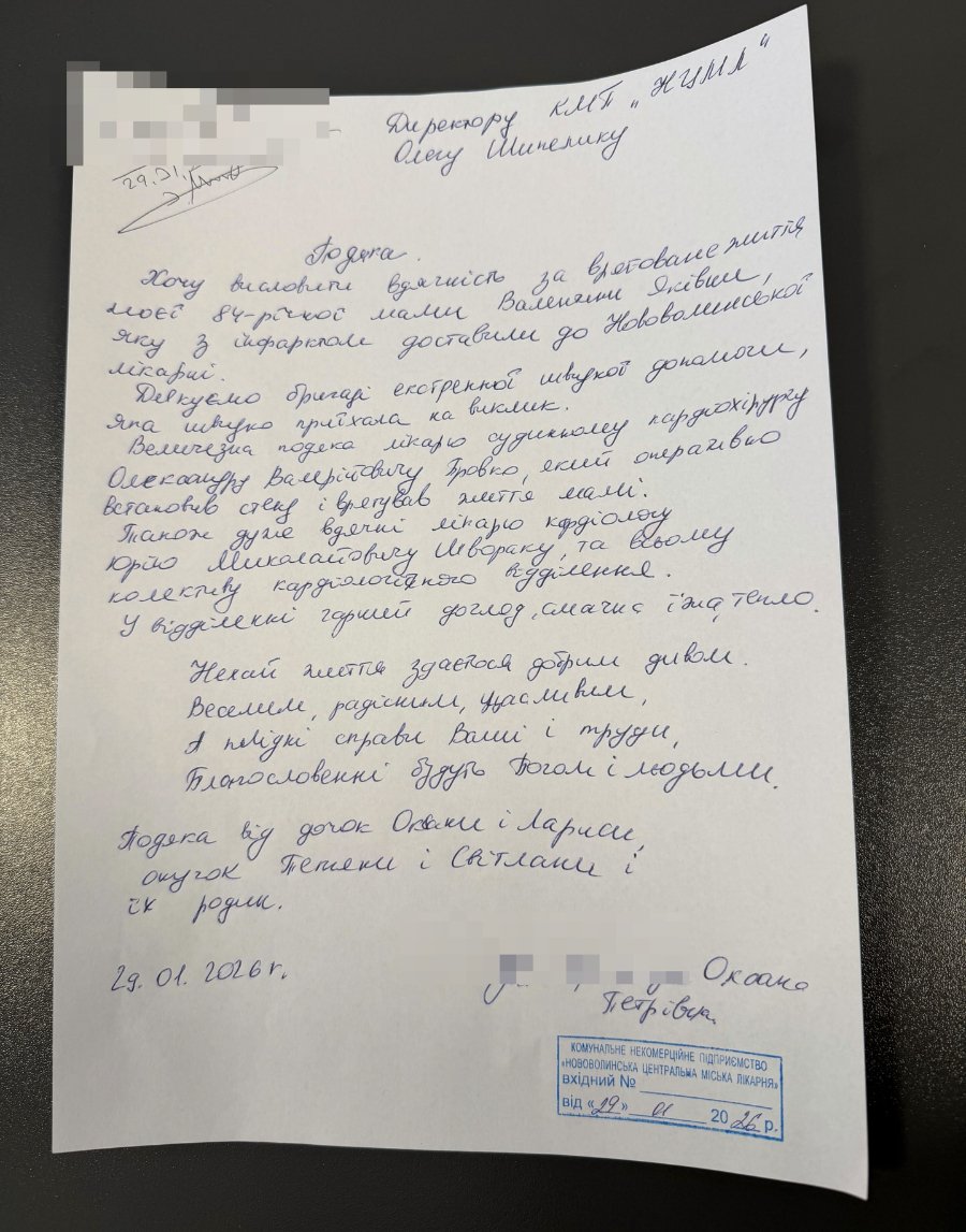 А також вдячність лікарю-кардіологу інтервенційному Юрію Швораку за професійне ведення пацієнтки. Та всьому колективу кардіологічного відділення КНП «Нововолинська ЦМЛ»: за уважний догляд та постійну турботу.