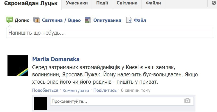 «Серед затриманих автомайданівців у Києві є наш земляк, волинянин, Ярослав Пужак. Йому належить бус-вольцваген. Якщо хтось знає його чи його родичів - пишіть у приват», - розповіла активістка.