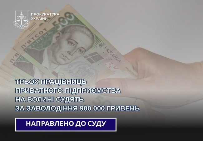 Трьох працівниць приватного підприємства на Волині судять за заволодіння 900 000 гривень.
