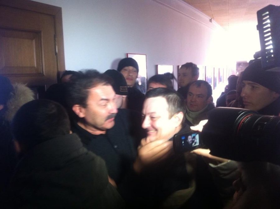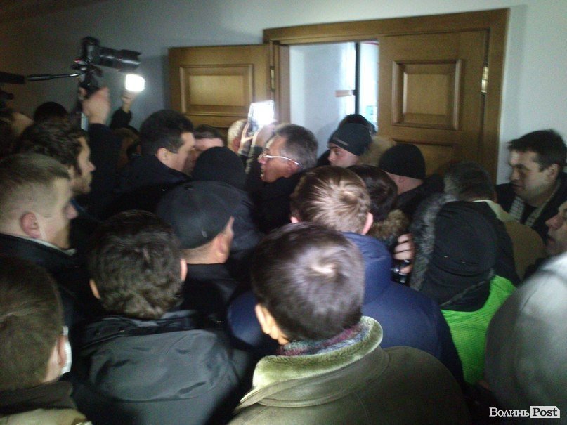 Перший заступник голови Волинської ОДА Олександр Башкаленко намагається потрапити в кабінет Клімчука. Люди його не пропускають, вимагають, аби він вийшов надвір до народу.