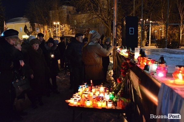 До сотні лучан зібралися біля сцени на Театральному майдані, де показували прямий ефір із подіями в Києві. Люди підходили до сцени і виставляли в ряд лампадки.