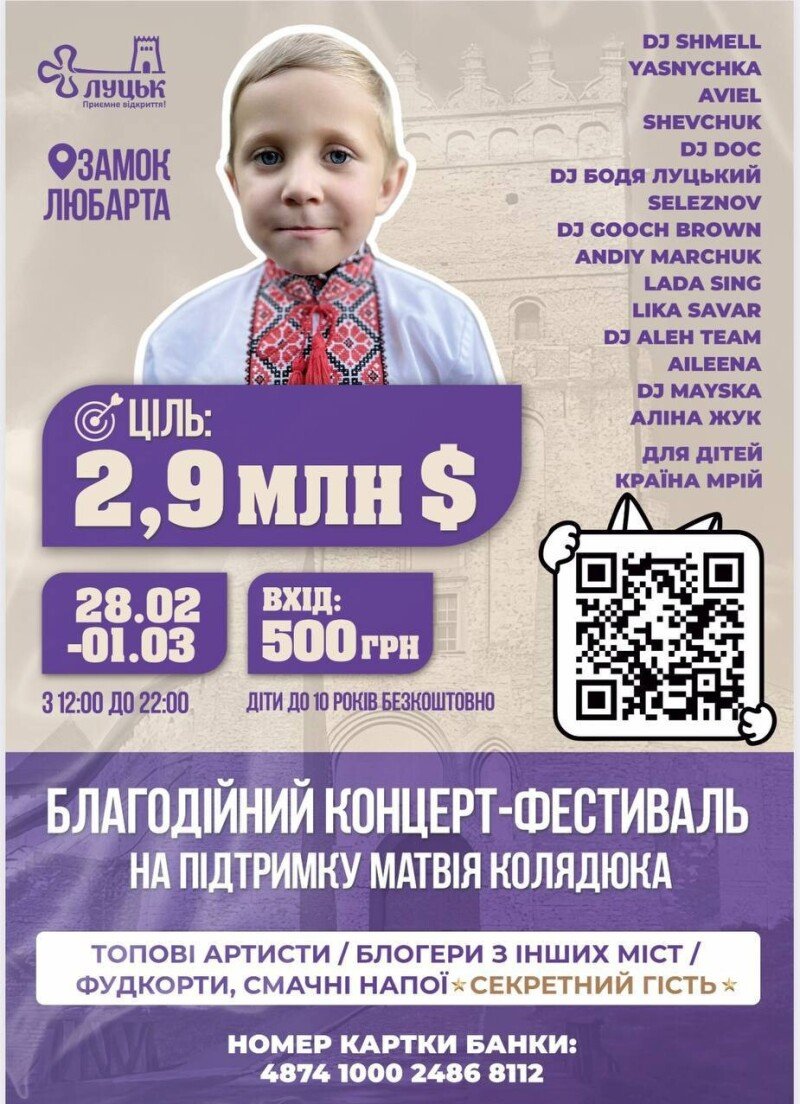 Вже завтра, 28 лютого у Луцькому замку розпочнеться перший день благодійного фестивалю для порятунку Матвія Колядюка.