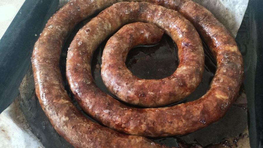 Ковбасу печуть у печі, розповіла Суспільному Оксана Лойко. М’ясо на ковбасу ріжуть на довгі тонкі смужки та маринують.