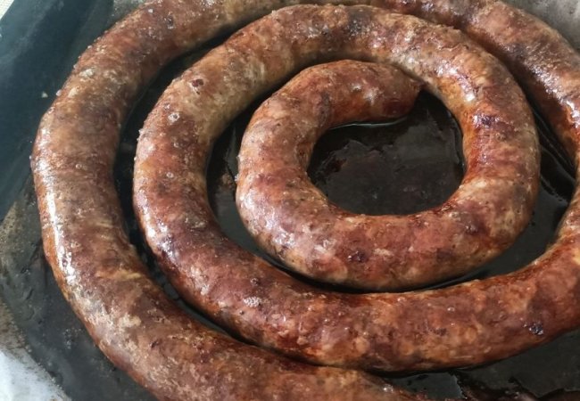 На кілограм фаршу господиня дає столову ложку солі й три чайні ложки перцю. Також додає часник і воду — щоб ковбаса була соковитіша.