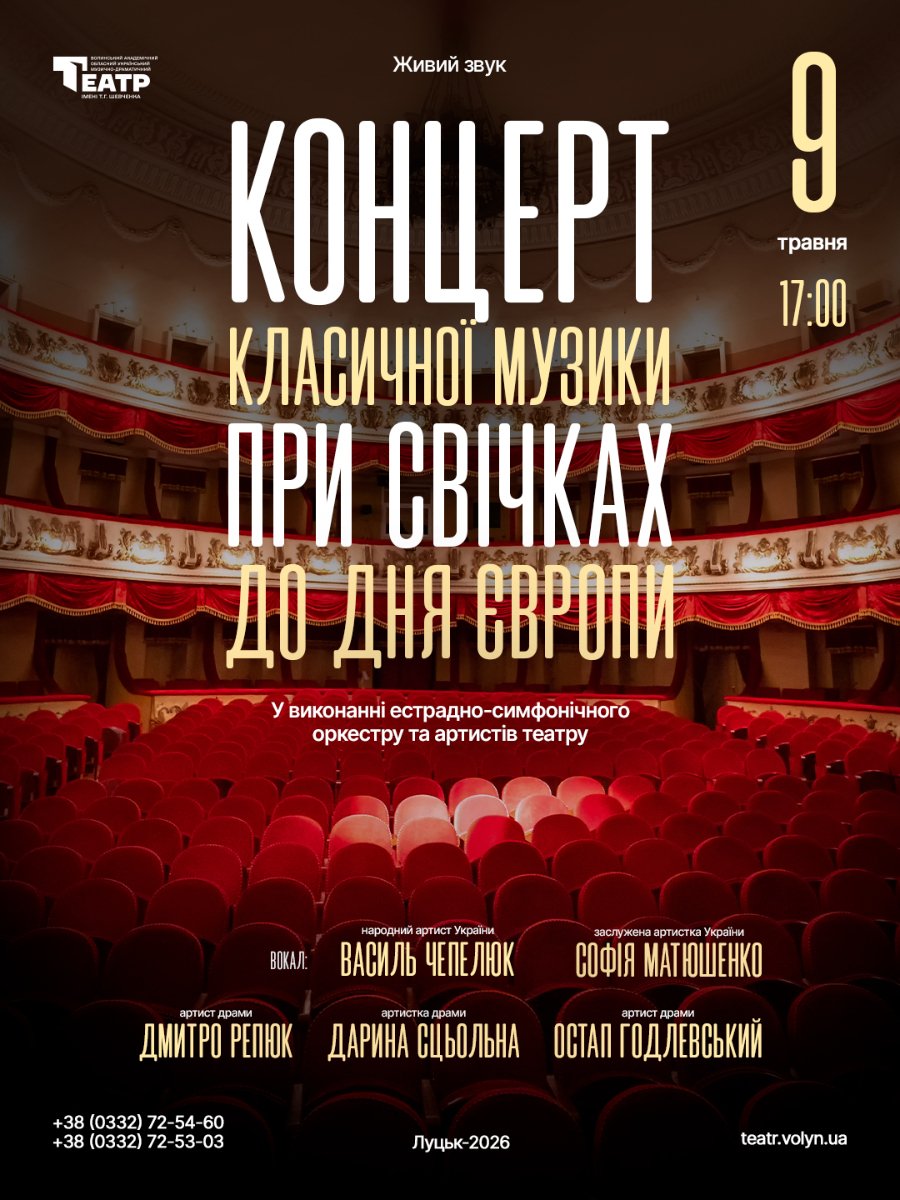 Волинський драмтеатр запрошує на концерт класичної музики при свічках до Дня Європи.
