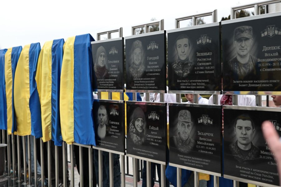 Після хвилини мовчання священнослужителі звершили молебень за душі полеглих захисників та освятили фотостенди. Разом із родинами загиблих, їхніми друзями, побратимами й жителями громади присутні поклали квіти.