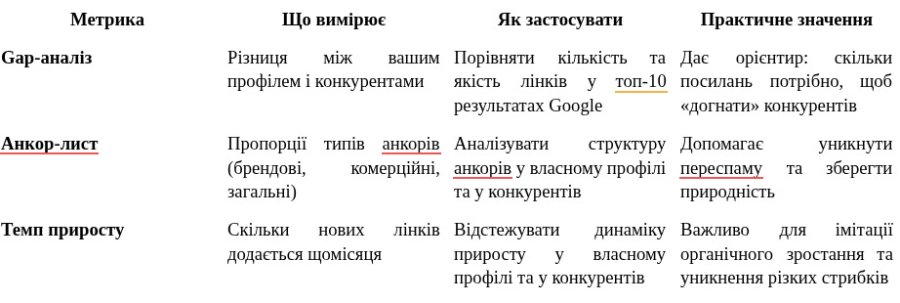 Топові конкуренти є вашим орієнтиром. Хороша новина – вам не потрібно більше посилань, достатньо аналогічної кількості. Нейтральна – доведеться сформувати трастовий профіль, який матиме цінність вищу, ніж у інших гравців ринку.