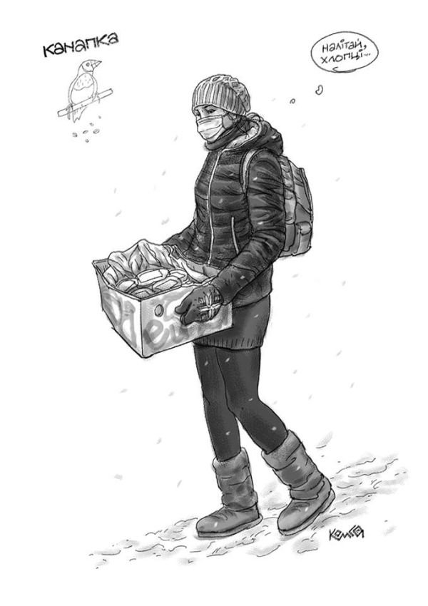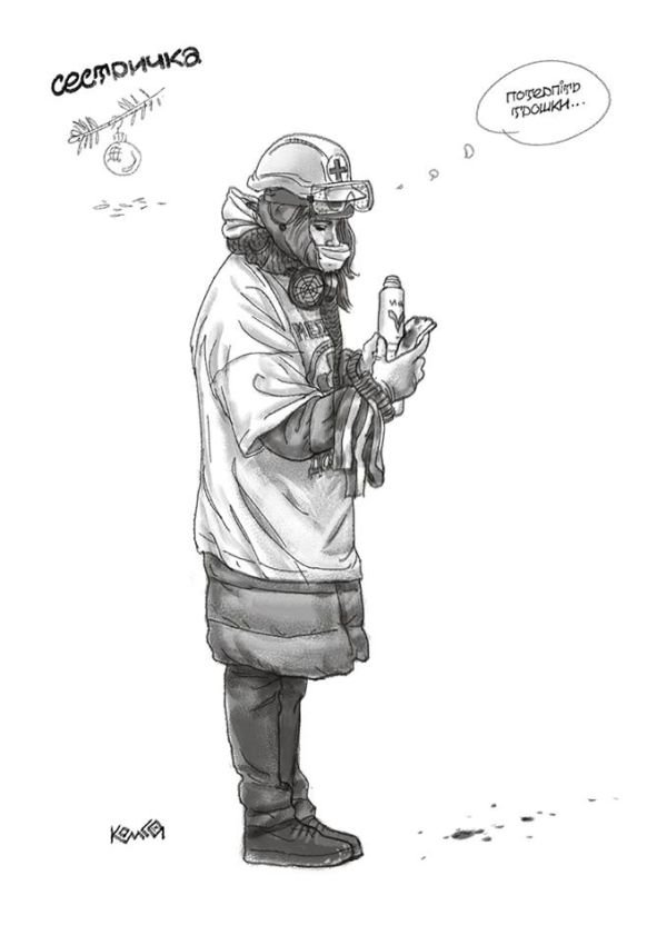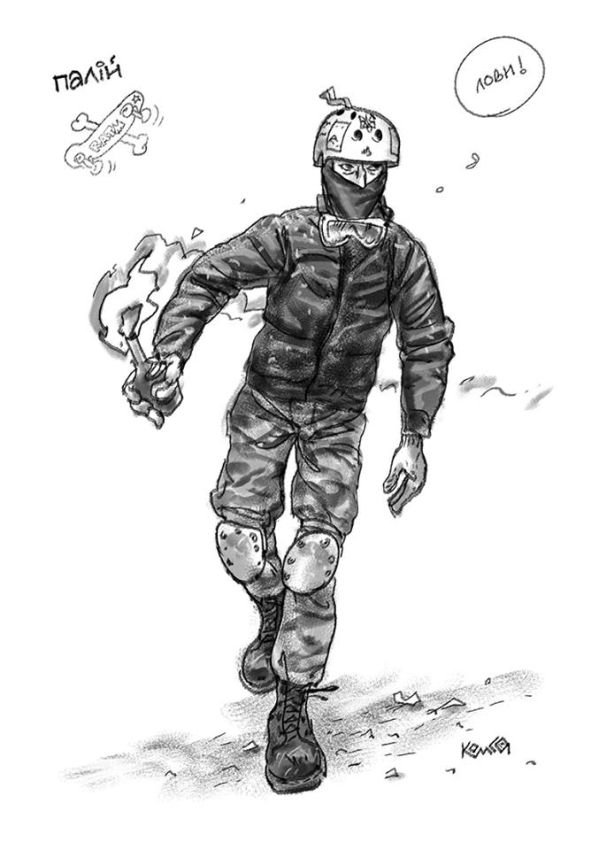 «Почалося з того, що Андрій Приймаченко попросив мене намалювати декілька скетчевих ілюстрацій до його оповідань. Там мова йшла про простих «несвідомих» людей. Намалював, відіслав, і стали ми чекати поки опублікують. А тут Грушевскього сталося. Я передивлявся скетчі і свої фото з місця подій. І стало шкода, що свідомі люди не намальовані. На фото їх не видно такими, якими я їх запам’ятав», ‒ розповів художник.