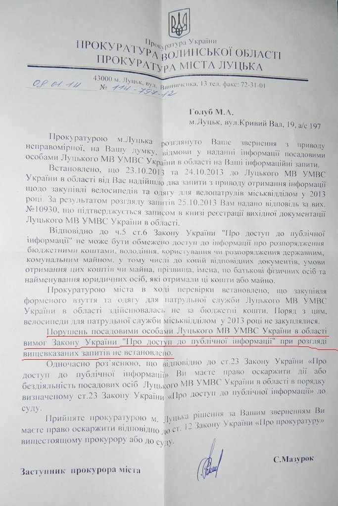 "Порушень посадовими особами Луцького МВ УМВС України у Волинській області вимого закону України «Про доступ до публічної інформації» при розгляді вищевказаних запитів не встановлено", - йдеться в листі з прокуратури міста Луцька.