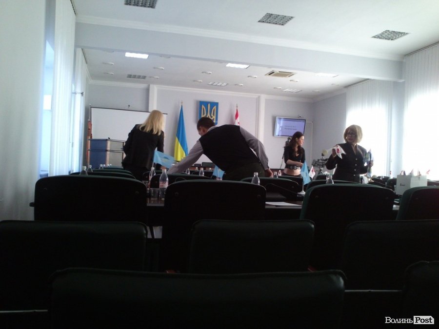 9:34 у залу починають «прибувати» люди. Члени секретаріату міськради принесли роздаткові матеріали, розкладають їх на столи депутатам, ставлять «партійні» прапорці членам різних фракцій.