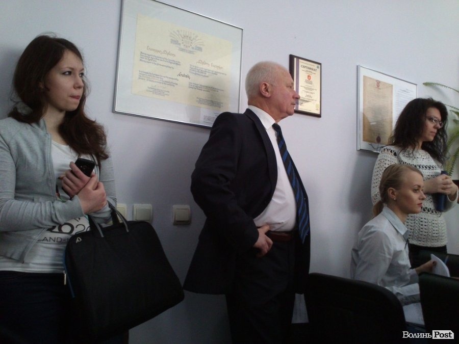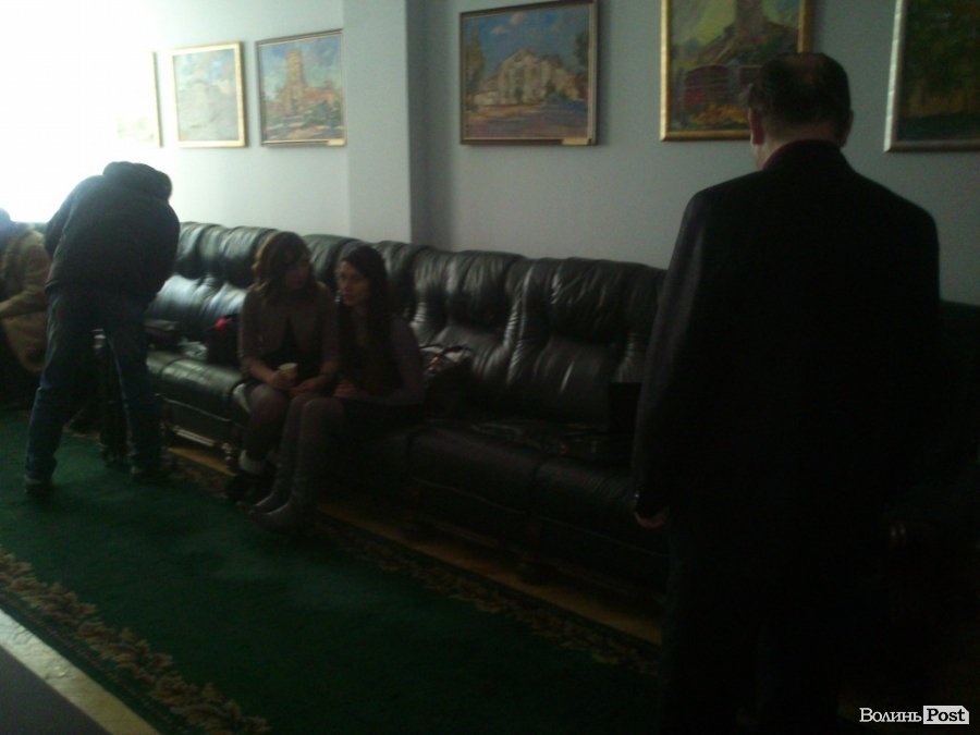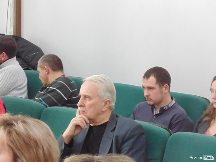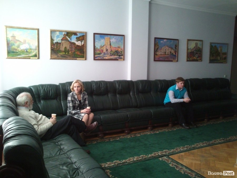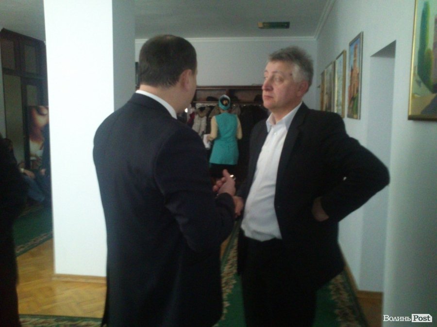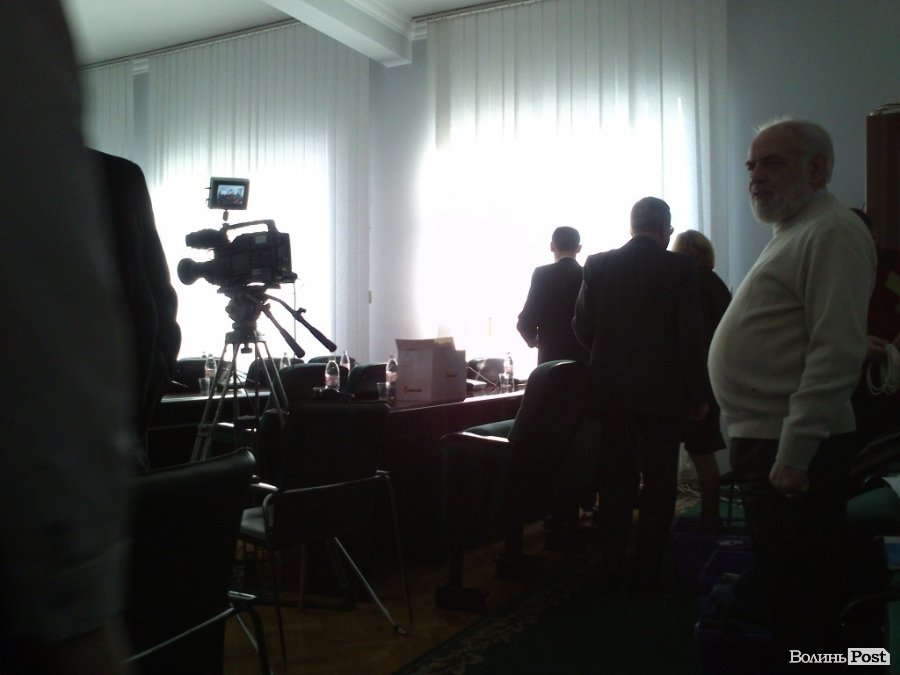 У холі перед залою – журналісти та деякі обранці громади. Депутат Сергій Сівак спілкується з прокурором Сергієм Мазурком з прокуратури Луцька.
