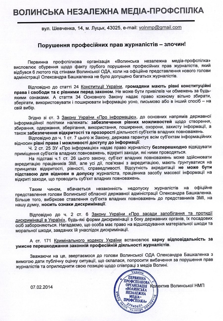 "Зважаючи на це, звертаємося до голови Волинської ОДА Олександра Башкаленка з вимогою дати публічну оцінку ситуації, що склалася, попросити вибачення за порушення прав журналістів та оприлюднити свою позицію щодо співпраці з медіа Волині", - резулюють в профспілці.