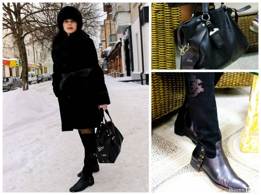 Образ на вулиці – просто супер. Сумка підібрана правильно до шубки, гармонійно виглядає. Шуба на бант, а банти зараз в моді. Чоботи теж вибрані добре. Адже бачимо: шубка коротка, а чоботи довгі. В образі акцент на губах.