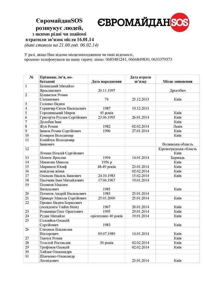 Як повідомляє спільнота активістів Євромайдан SOS, станом на 21:00 6 лютого розшукує 31 особу.