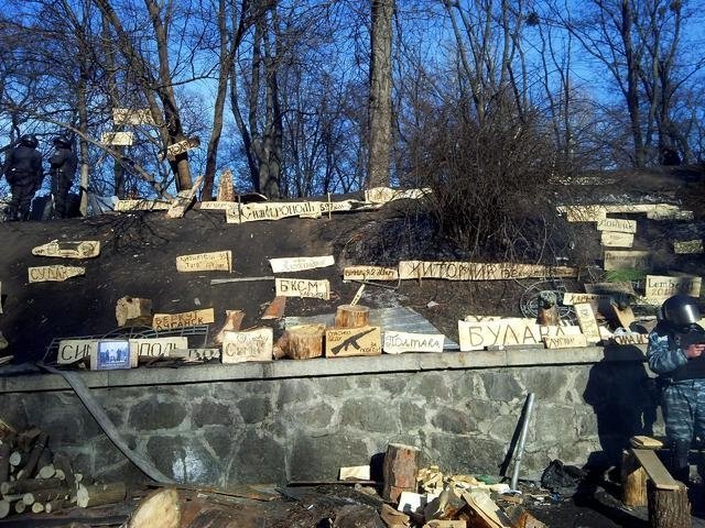 На ділянці вулиці Грушевського ближче до барикад дорогу не чистять, тому там утворився шар льоду упереміш з брудом. Міліціонери, як і активісти на Майдані, зробили «стіну координат» з дерев’яних табличок з назвами того чи іншого регіону та іншими написами. Тож, на Грушевського, судячи з усього, побував луганський «Беркут», бійці з Криму, Полтави, Житомира, представники спецпідрозділів «Ягуар», «Тигра». На одній із табличок з малюнком автомата написано: «Спасибо деду за победу!»