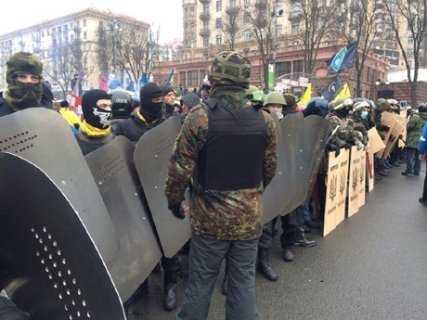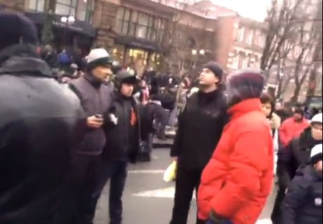 У свою чергу на Майдані Незалежності загони самооборони оголосили мобілізацію: кілька сотень людей вишикувалися в масках зі щитами і битами із зовнішнього боку барикади на перетині вул. Хрещатик та Б.Хмельницького біля ЦУМу.
