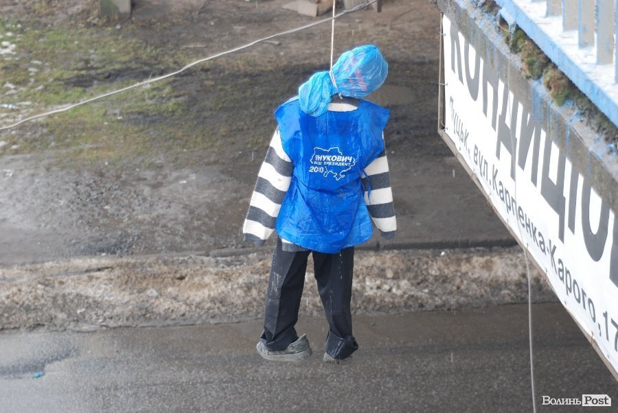 У Луцьку на шляхопроводі біля Завокзального ринку ("варшавки") повісили макет людини, одягнений у символіку Партії регіонів.