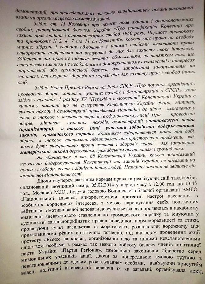 «Москвич М.Ю., використовуючи протестні настрої населення в особистих корисливих інтересах, з метою нарощування своїх політичних рейтингів, з мотивів явної неповаги до суспільства, яка проявилась в нахабному виявленні зневажливого ставлення до громадського порядку та існуючих у суспільстві загальноприйнятих правил поведінки, норм моральності та етики, пропагуючи культ насильства та жорстокості, розпалюючи ворожнечу між прихильниками різних політичних поглядів, під виглядом проведення акції протесту «Бізнес на крові», організованою нею та іншими невстановленими слідством особами в рамках так званого бойкоту бізнесу членів політичної партії України «Партії Регіонів», самовільно захопивши лідерство серед мимовільних учасників акції, діючи за попередньою змовою групою з невстановленими досудовим слідством особами, нав’язуючи присутнім власні політичні інтереси та видаючи їх як загальні, організувала похід демонстрантів в кількості приблизно 20-25 осіб з Театральної площі до будівель(власників членів Партії регіонів, - ред.)», - йдеться у повідомленні.