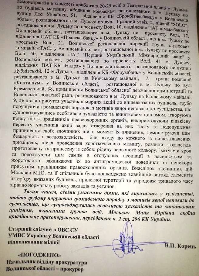 «Внаслідок злочинних дій Москвич М.Ю. та її спільників було пошкоджено зовнішній вигляд елементів інтер’єру…будівель, прилеглої території та упродовж тривалого часу зірвано нормальну роботу закладів та установ», - резюмують слідчі.
