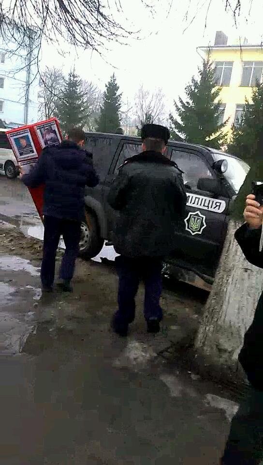 Міліціонери конфіскували «дошку ганьби» з фото регіоналів у Володимирі-Волинському.