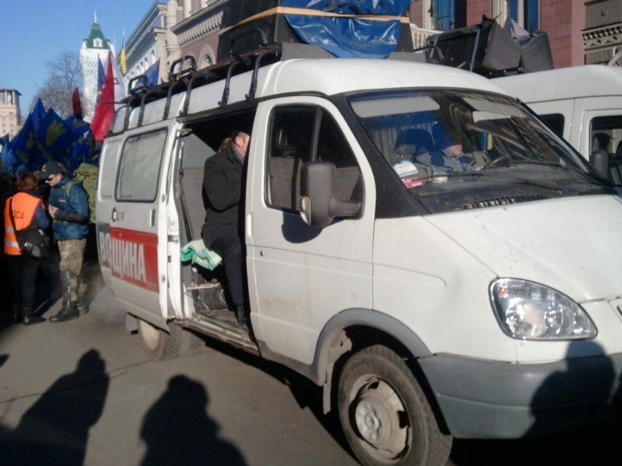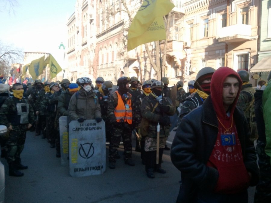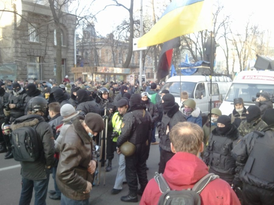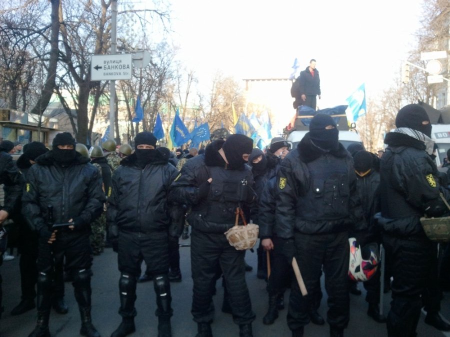Одразу як мітингувальники підійшли до Верховної Ради, бійці самооборони майдану заскочили на вантажівку, що перекривала вулицю. Звідти вони виштовхали силовиків.