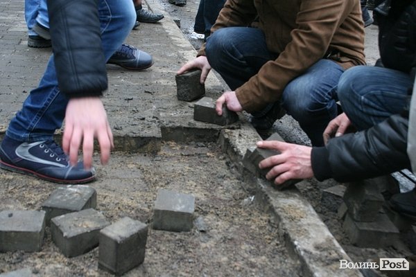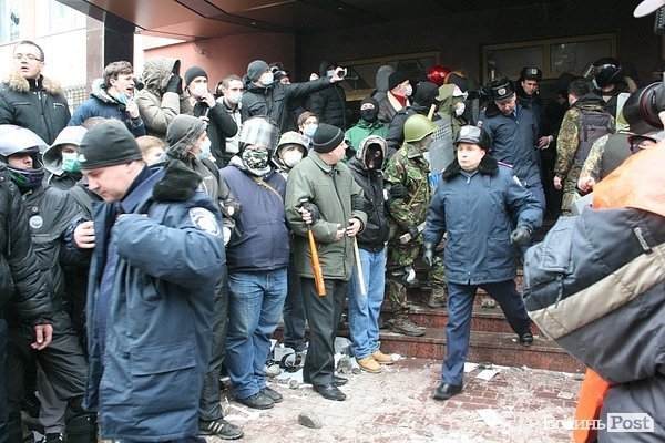 Очевидці кажуть, міліцію почала першою кидати світло-шумові гранати. Станом на 12:00 в приміщення вже летіли перші плитки з тротуару. Мітингувальники розбирали тротуари прямо біля самісінького управління.