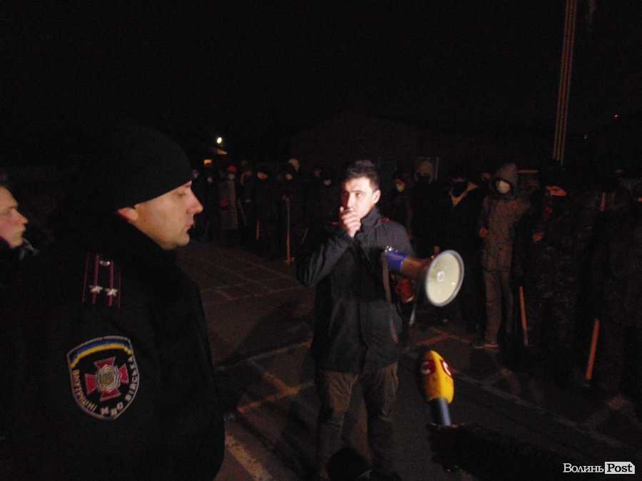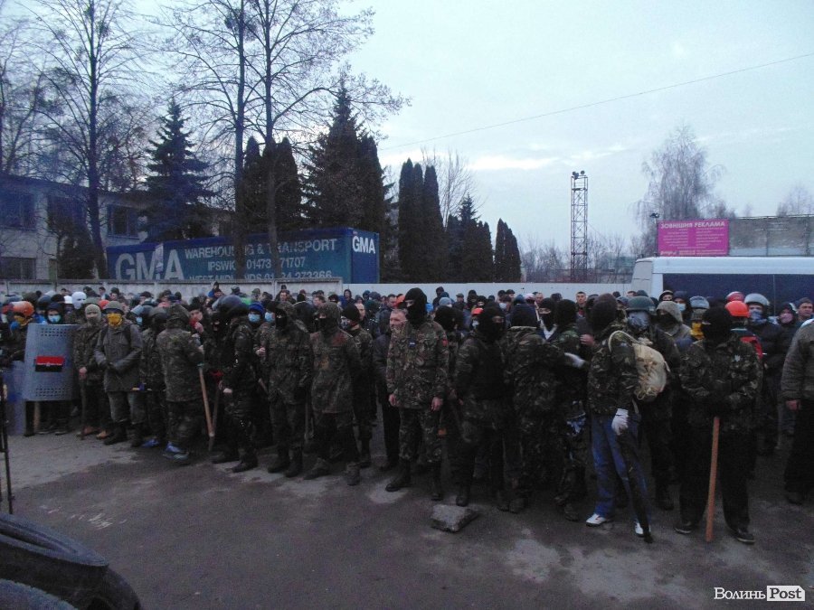 Самооборонівці та праві вишикувалися перед в'їздом на базу, натомість координатор Правого сектору на Волині Павло Данильчук пішов на переговори із командиром частини Степаном Логушем.