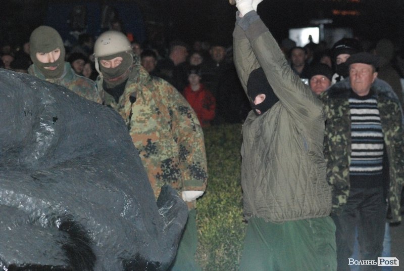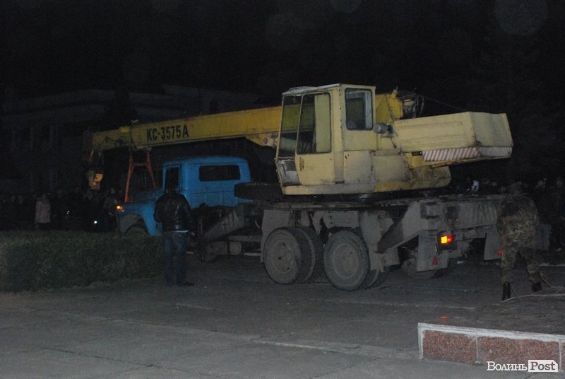 Триметровий бронзовий пам"ятник Леніна, який стояв на центральній площі райцентру Волинської області - селищі Маневичі - активісти Правого Сектору та Автомайдану знесли увечері п'ятниці, 21 лютого.