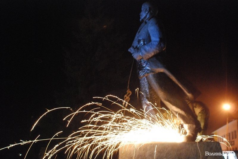 Спочатку Леніну підпиляли "ноги", а тоді потягнули краном, прив'язавши до статуї троси.