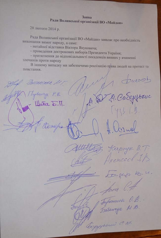 Рада Волинської організації ВО «Майдан» заявляє про необхідність виконання вимог народу, а саме: