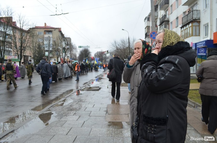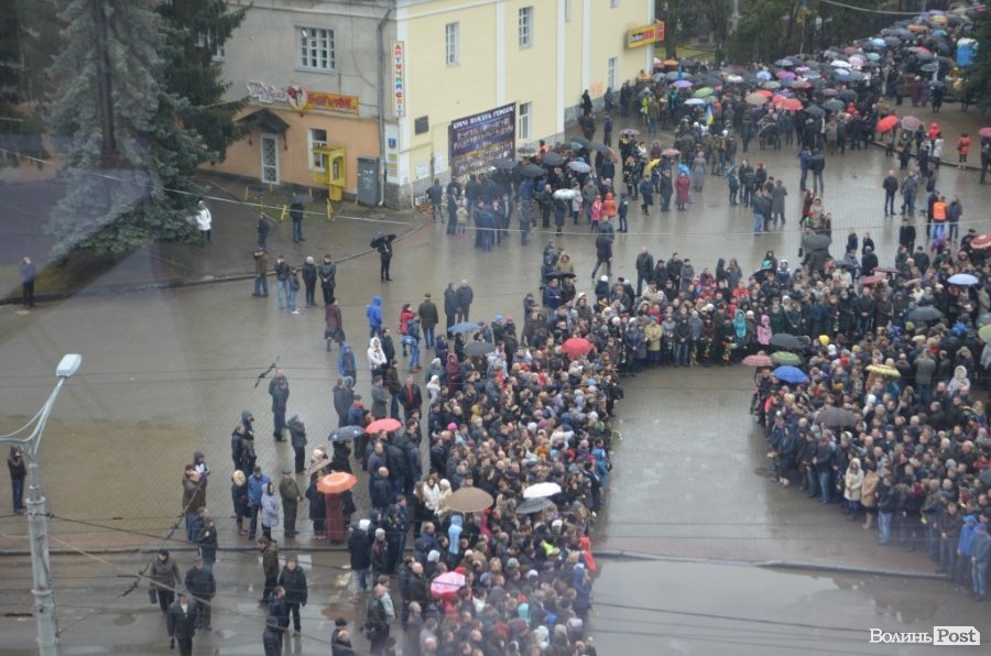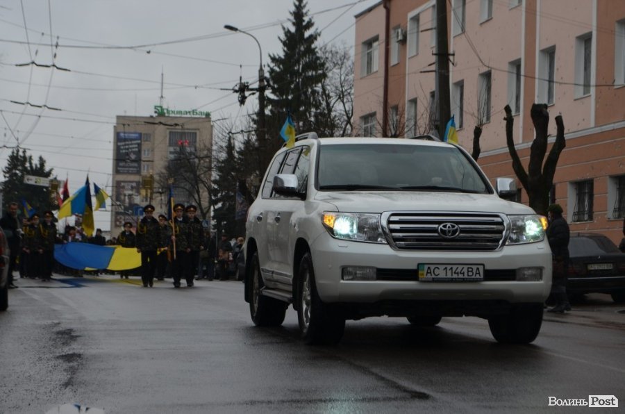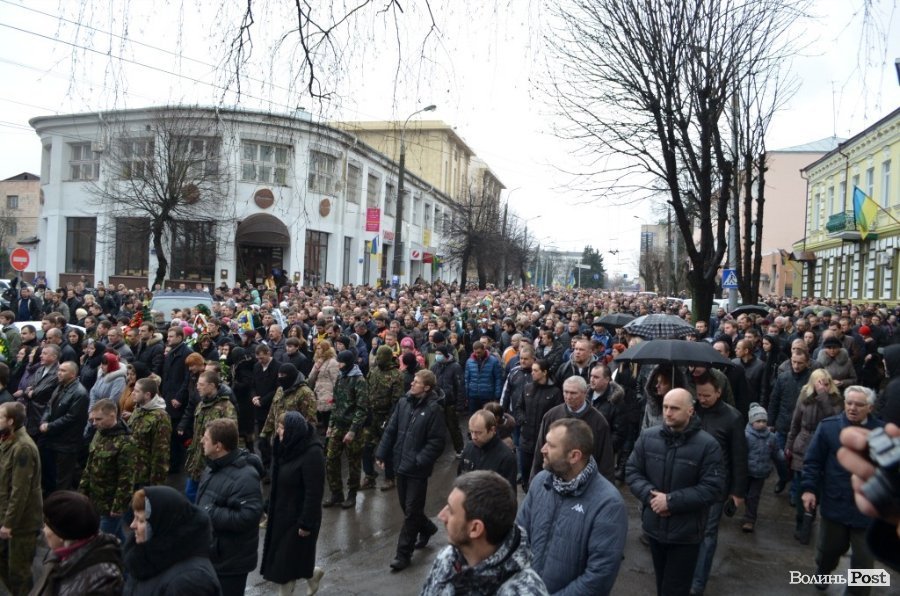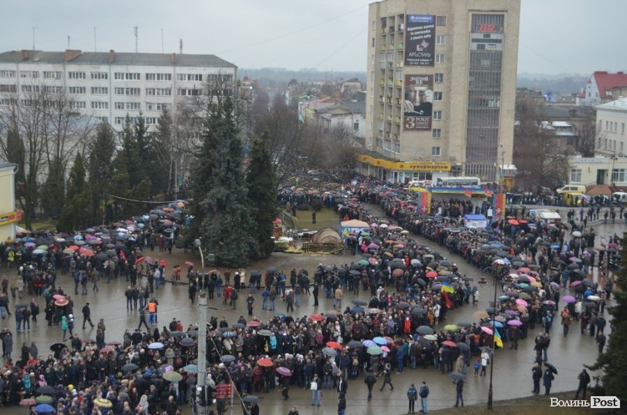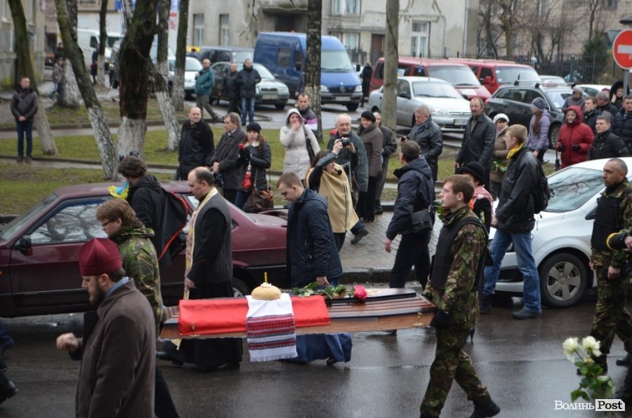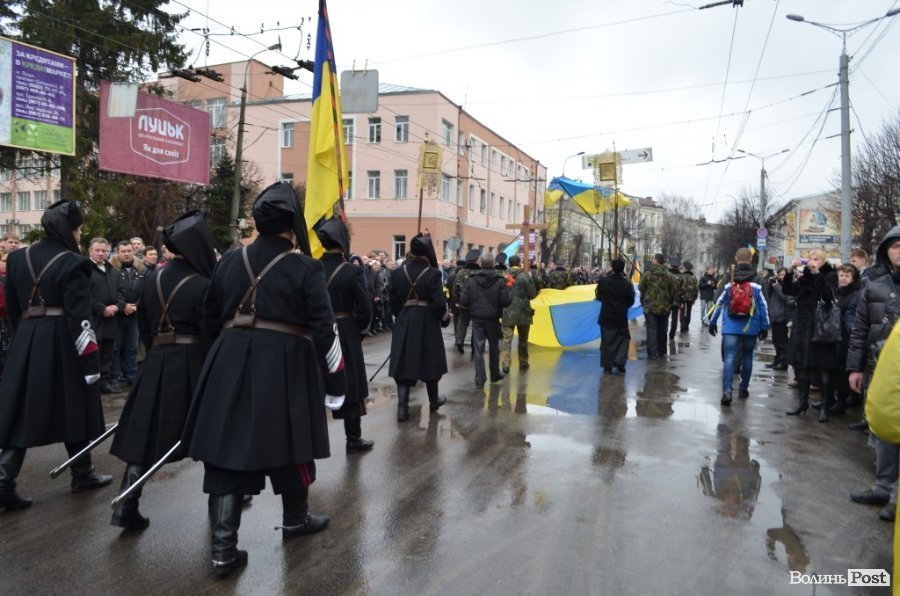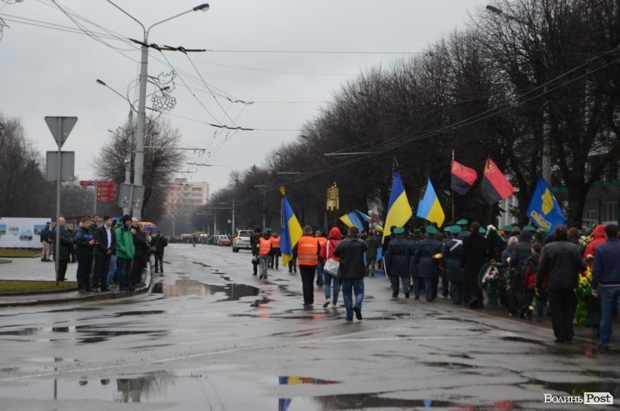 Хода розпочалася на Театральному майдані після відспівування загиблого майданівця у Свято-Троїцькому кафедральному соборі у Луцьку приблизно о 12:30 у неділю, 23 лютого.