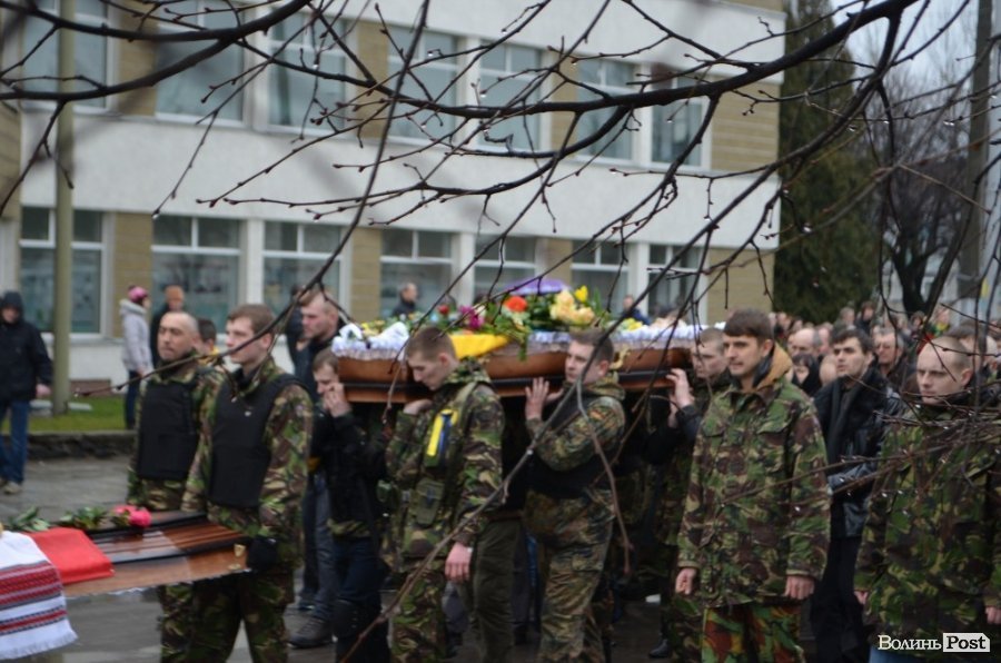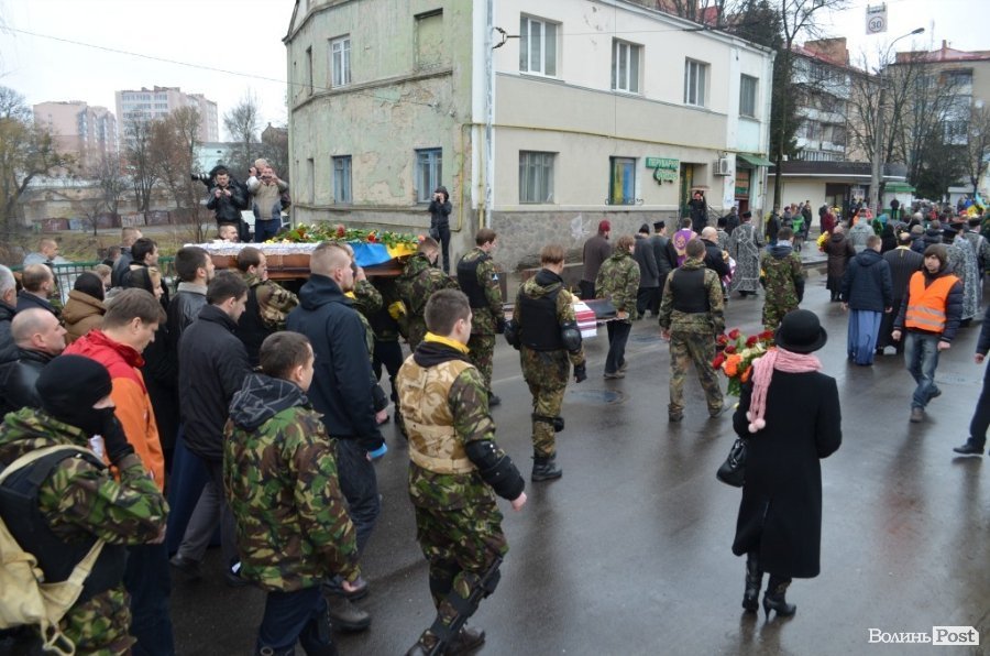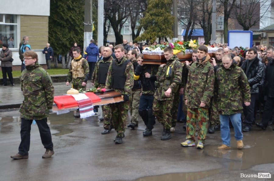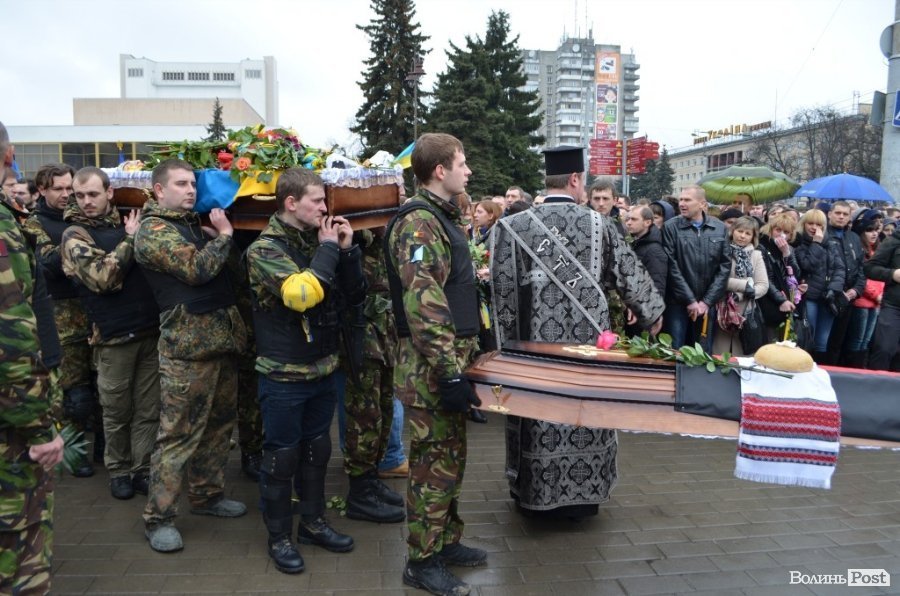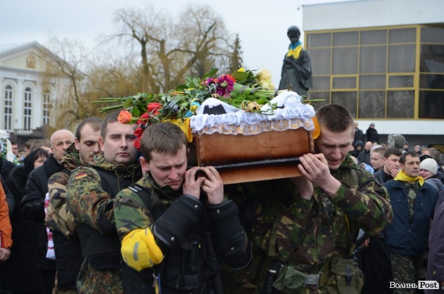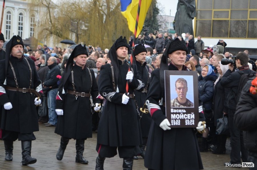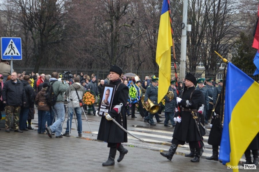Домовину із загиблим Героєм Майдану Василем Мойсеєм пронесли вулицями Луцька до місця поховання на Меморіалі Слави.