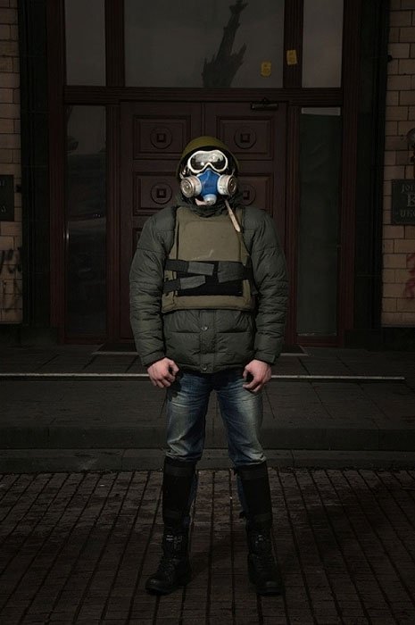 Демонстрант приміряє протигаз. Майданівцям допомагають самі різні люди, жертвуючи припаси, теплі речі, старе військове обмундирування, амуніцію, засоби захисту та інші необхідні предмети.
