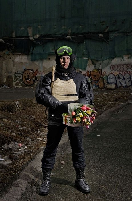 Хлопець несе квіти і торт, щоб відсвяткувати день народження подруги на Майдані. У рідній Вінниці він працював продавцем у супермаркеті. А тепер він борець за свободу.