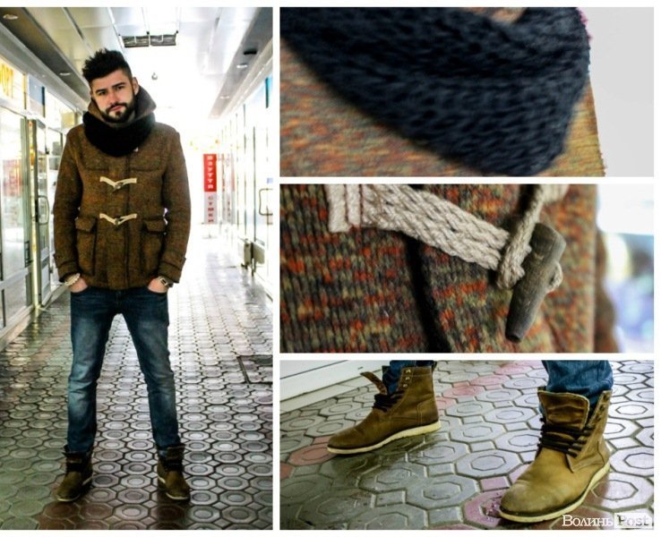 Сьогоднішній наш герой дуже стильний. Все вдало підібране: взуття підходить в тон верхнього вбрання. Навіть браслети, на перший погляд незрозумілі, пасують під застібки та черевики, а отже під загальний лук. Шарф також замотаний саме так, як зараз модно.