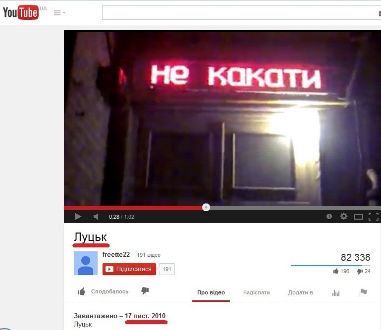 Насправді, як повідомляли волинські медіа, цей напис – з електронного табло, встановленого над входом до однієї з луцьких багатоповерхівок. Інформація про нього, як і зняте на мобільний телефон відео з цим табло (саме це відео використали росіяни у сюжеті), з’явилося в інтернеті ще у листопаді 2010 року.