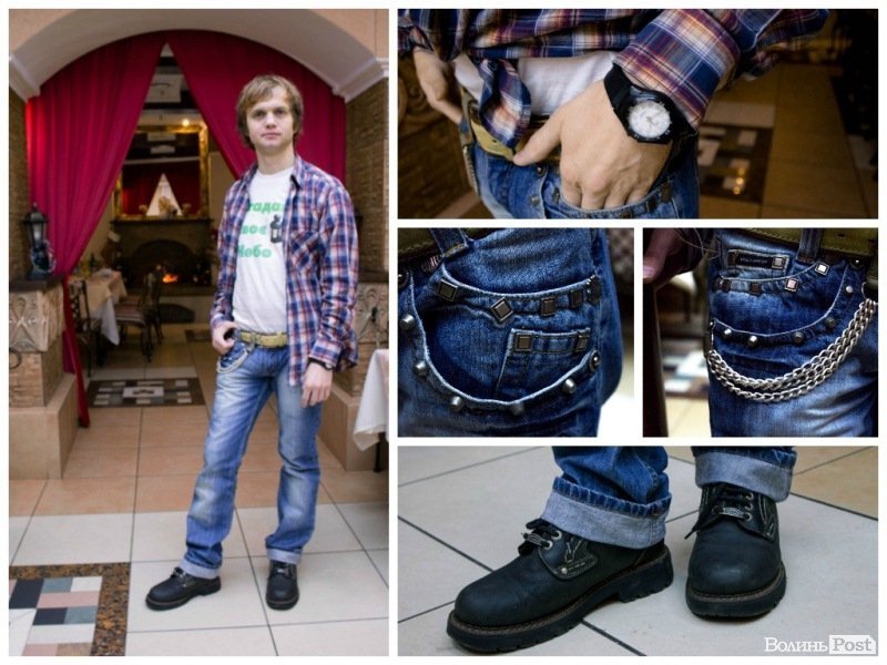 В образі героя черевики підходять до джинсів – досить стильно. Штани добре підгорнуті для літа, але не для зими. Явний недолік джинсів – це їх довжина – вони задовгі. Також до взуття добре дивиться годинник. Джинси підходять до образу музиканта, насамперед через те, що є металеві вставки, ланцюжок. Однак ремінь не підходить. Краще було б, якби він був червоний – підкреслював би сорочку, або чорний – підкреслював би взуття і підтримував годинник.
