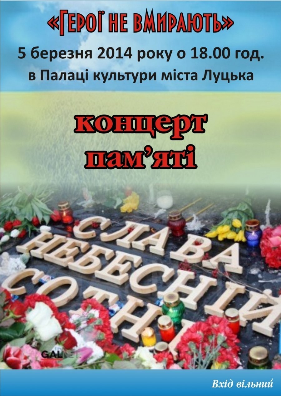 У Луцьку відбудеться концерт "Герої не вмирають", під час якого вшанують "Небесну сотню".