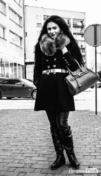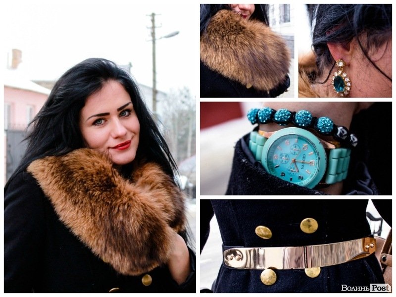 На фото дівчина одягнута у пальто з хутряним коміром, штани, взута у чоботи. Весь образ доповнила поясом, сумкою, годинником та браслетом, сережками. На жаль, дівчина не пригадала назв брендів свого одягу та прикрас.
