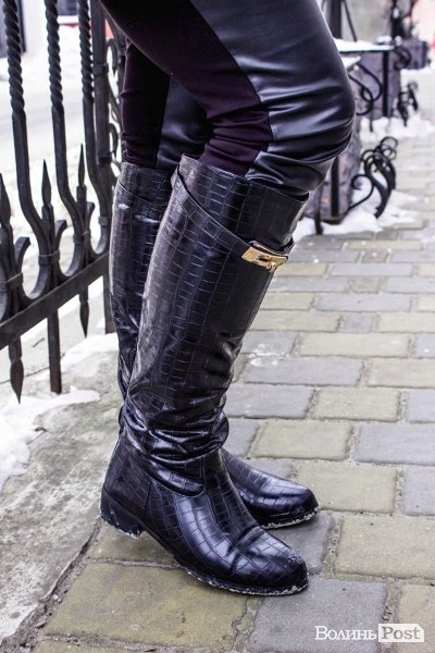 Штани підходять до образу. Звісно, не тренд сезону, але модні. Єдина заувага щодо нижньої частини образу – взуття, де є крокодиляча шкіра, яка не поєднується із сумкою, але через те, що вони чорні – акценту на себе вони не беруть.