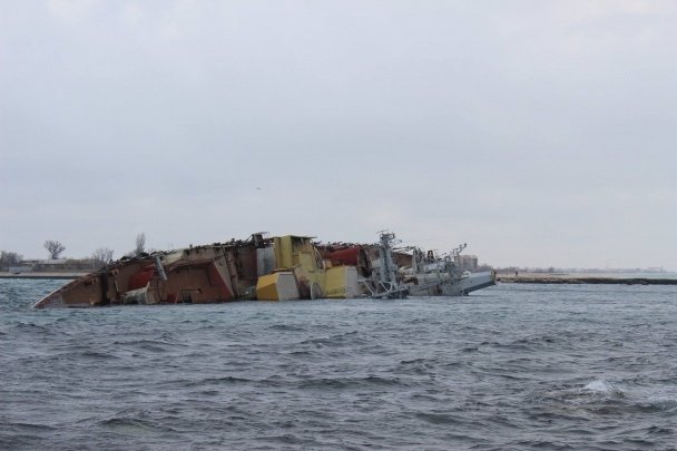 «Затоплений один корабель! Лежить на боці, повністю перекриваючи вихід з бухти. Над водою підноситься на висоту до дев'яти метрів. Корабель великий - близько 120 метрів у довжину. Просто так відтягнути його неможливо. Або різати на частини і відтягати сторони, або підривати - кажуть фахівці», - написав у Facebook начальник Кримського медіа-центру Міноборони Владислав Селезньов.