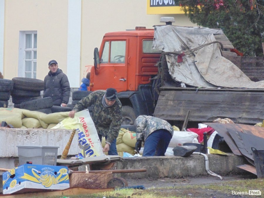 Окрім того, будуть розбирати барикади. Для цього пригнали "КамАЗ", на який поки закидають сміття, а згодом планують завантажити мішки, шини та піддони.