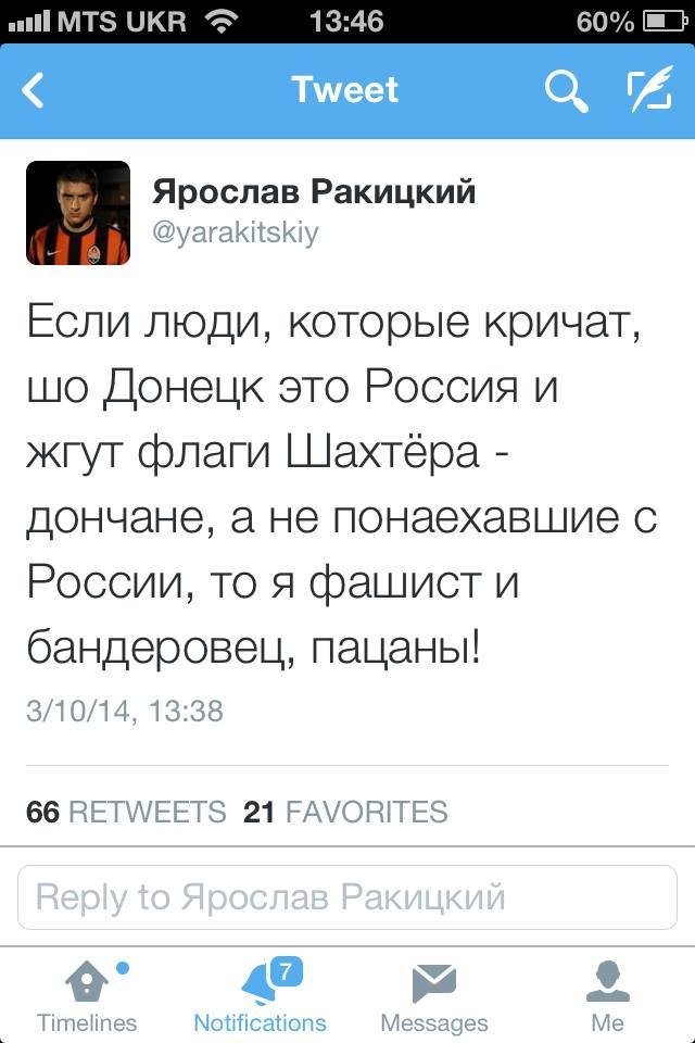"Якщо люди, які кричать, що Донецьк це Росія і палять прапори "Шахтаря" - донеччани, а не приїхавші з Росії, то я фашист і бандерівець, пацани!", - пише він.