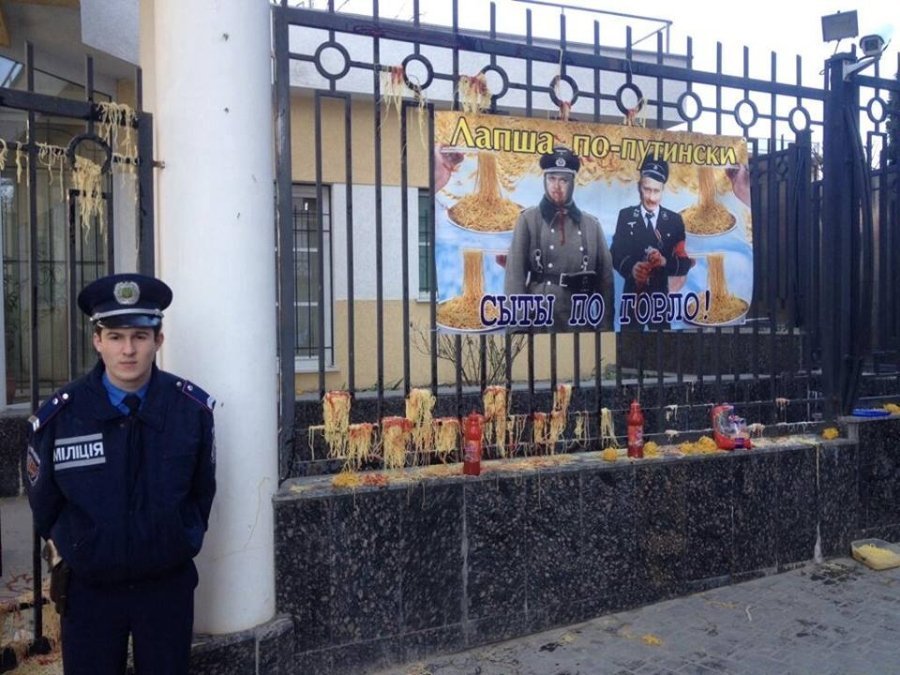 Також біля будівлі повісили плакат з написом «Лапша по-путински. Сыты по горло!».