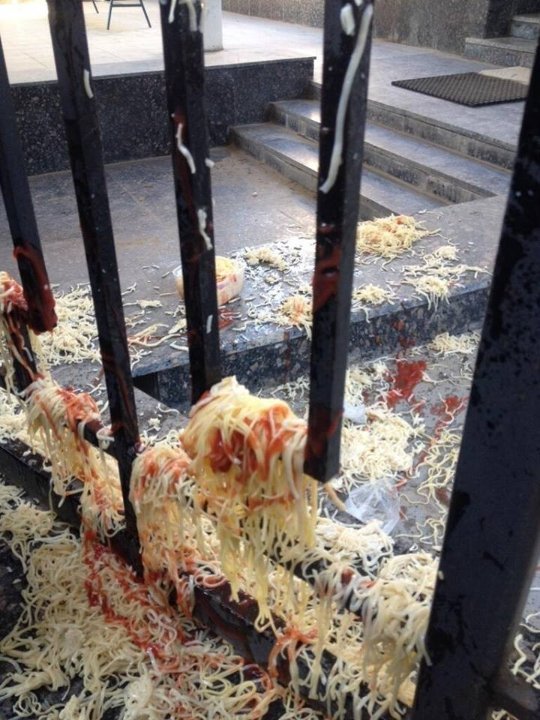 Вони обкидали центральний вхід локшиною та кетчупом, - пише Еспресо.tv.