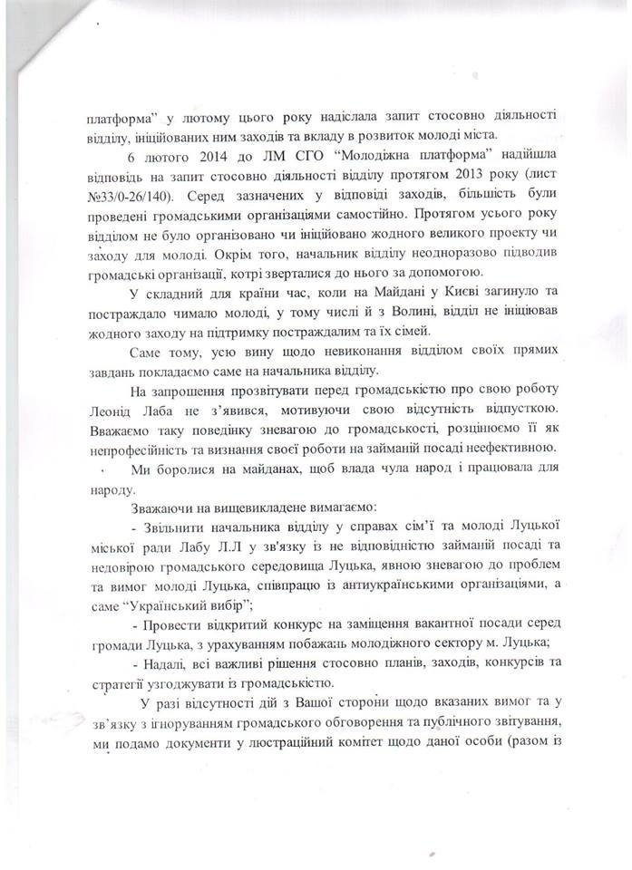 На зустріч віце-мер не прийшов, бо 14 березня відбувалася сесія облради. А Лаба на запрошення активістів відповів листом, в якому вказав, що не може прибути, бо перебуває у відпустці.